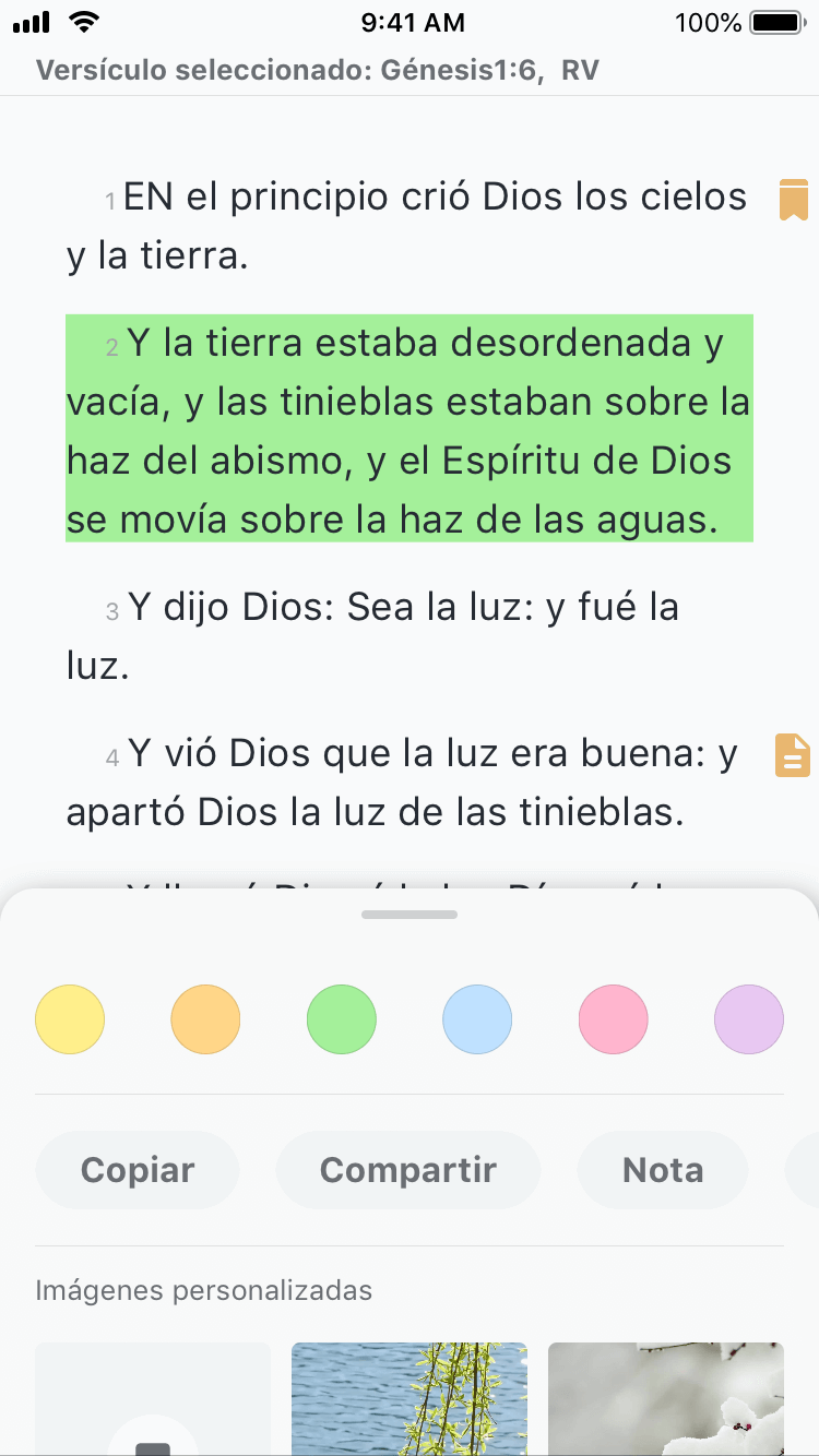 Selecciona un versículo en la página Biblia para añadirle un marcador o resaltarlo y utiliza la función. Notas para registrar en cualquier momento lo que hayas aprendido del estudio las Escrituras.