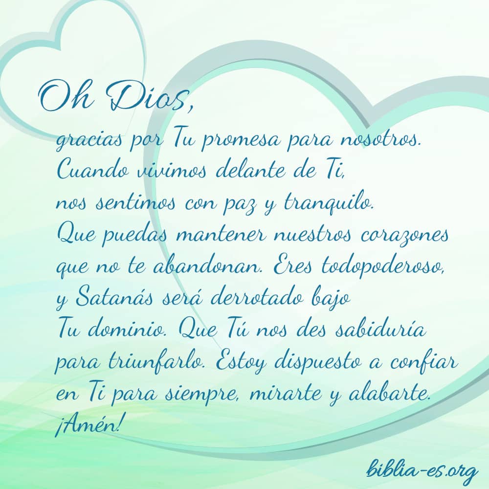 Oh Dios, gracias por Tu promesa para nosotros. Cuando vivimos delante de Ti, nos sentimos con paz y tranquilo. Que puedas mantener nuestros corazones que no te abandonan. Eres todopoderoso, y Satanás será derrotado bajo Tu dominio. Que Tú nos des sabiduría para triunfarlo. Estoy dispuesto a confiar en Ti para siempre, mirarte y alabarte. ¡Amén!